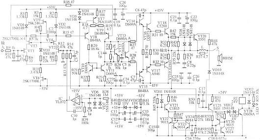 如圖所示(圖中只畫出一個聲道)。為減小失真,輸入級采用差動放大電路。V1用對管2SC1583,穩(wěn)定性和對稱性好;V2接成恒流源,為本級提供穩(wěn)定的靜態(tài)工作電流,采用恒流源作差動放大器的射極電阻,可提高差動放大器的共模抑制比和動態(tài)范圍,從而進一步改善失真。c1為輸入耦合電容,R1、c2構(gòu)成低通濾波器,阻止前級的超音頻干擾信號竄入功放;R2決定了功放的輸入阻抗。合形式,是從成本上考慮的。若全用場效應(yīng)管,效果更好。