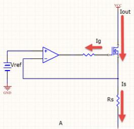 采樣電阻Rs、運放構(gòu)成一比較放大電路,MOS管輸出回路的電流經(jīng)RS轉(zhuǎn)換成電壓后,反饋到運放反向端實現(xiàn)控制vgs,從而MOS管輸出回路的電流。當(dāng)給定一個電壓VREF時,如果Rs上的電壓小于 VREF,也就是 運放的-IN小于+IN,運放加大輸出,使MOS導(dǎo)通程度加深,使MOS管輸出回路電流加大。如果 Rs 上的電壓大于 VREF時,-IN大于+IN,運放減小輸出,也就MOS管輸出回路電流,這樣電路最終維持在恒定的給值上,也就實現(xiàn)了恒流工作。