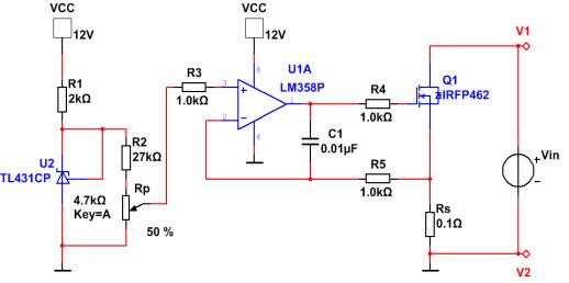 基本原理:MOS和電阻Rs組成負(fù)反饋電路,MOS管工作在恒流區(qū),運放同相端調(diào)節(jié)設(shè)定恒流值,MOS管的電流在電阻Rs上產(chǎn)生壓降,反饋到運放反向端實現(xiàn)控制輸出電流。R1、U2構(gòu)成一2.5V基準(zhǔn)電壓源,R2、Rp對這2.5V電壓分壓得到一參考電壓送入運放同相端,MOS管輸出回路的電流Is經(jīng)Rs轉(zhuǎn)換成電壓后,反饋到運放反向端實現(xiàn)控制vgs,從而控制MOS管輸出回路的電流Is的穩(wěn)定。電容C1主要作用有2個,一方面是消雜波,另一方面也是對運放輸出的梯波進(jìn)行補償,使得電壓變化速度減緩,盡量減少mosfet的G極電壓高頻變化引發(fā)振蕩的可能。