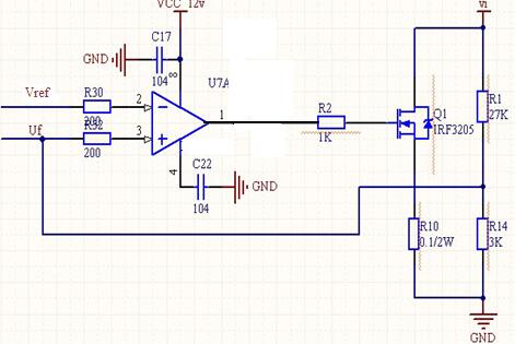 當(dāng)Uf>Vref時,運放加大輸出,MOS管導(dǎo)通程度加深,使得MOS管輸出回路上的電壓下降;