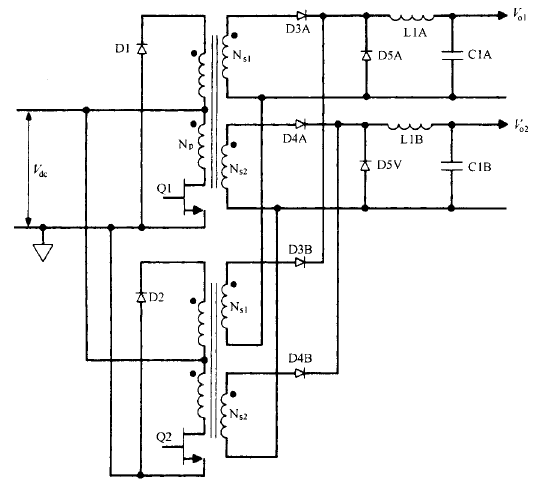 不過(guò)至今仍不很肯定 , 在輸入和負(fù)載失常的 瞬態(tài)情況下 ,推挽拓?fù)涞拇磐ú黄胶鈫?wèn)題能否完好能處置 。沒(méi)有磁通不平衡問(wèn)題可能是運(yùn)用交錯(cuò)正激變換器的最好理由 。 在較少見(jiàn)的直流輸出電壓超越 200V 的場(chǎng)所,同樣的輸出功率下 ,選用交錯(cuò)正激變換器比選用單個(gè)正激變換器更合理 。單個(gè)正激變換器輸出續(xù)流二極管( D5A 或 D5B ) 承受的反向 電壓峰值為交錯(cuò)正激變換器的兩倍 。
