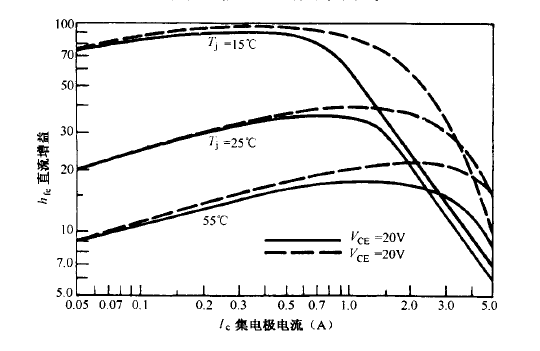 圖 9.13  雙極型晶體管的直流增益曲線 。雙極型晶體管的增益隨著輸出電流的增大而減小 ,而MOSFET 管不存在這種情況 ,MOSFET 管最大電流只受結(jié)點(diǎn)溫升的限制