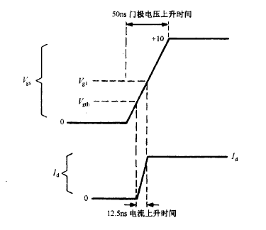 圖若柵極電壓上升時(shí)間為 50ns ,則漏極電流上升時(shí)間為 12.5ns。柵極電壓從 ov 上升到 2.5V 的闕 值電壓的時(shí)間只是一個(gè)延遲時(shí)間 。當(dāng)柵極電壓達(dá)到 5    7V 時(shí),大部分漏極電流已經(jīng)建立起來。