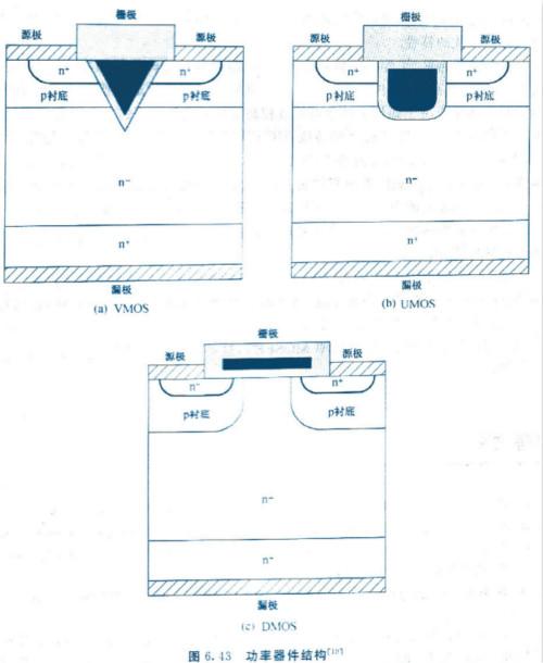 圖6.43為三個(gè)基本的功率MOSFET結(jié)構(gòu).與ULSI電路中的MOSFET器件不同的是,功率MOSFET采用源極與漏極分別在晶片上方與下方的垂直結(jié)構(gòu).垂直結(jié)構(gòu)有大的溝道寬度以及可降低柵極附近電場擁擠的優(yōu)點(diǎn).這些特性在高功率的應(yīng)用上非常重要.