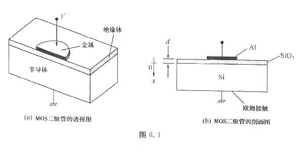 MOS二極管的透視結(jié)構(gòu)如圖6.1(a)所示,圖6.1(b)為其剖面結(jié)構(gòu),其中d為氧化層的厚度,而V為施加于金屬平板上的電壓.在本節(jié)中,當(dāng)金屬平板相對(duì)于歐姆接觸為正偏樂(lè)時(shí),V為正值;而當(dāng)金屬平板相對(duì)于歐姆接觸為負(fù)偏壓時(shí),V為負(fù)值。