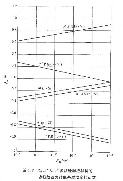 半導(dǎo)體的功函數(shù)坤;為費(fèi)米能級(jí)至真空之間的能量差(圖6,2),隨摻雜濃度而有所變化,對(duì)于一有固定功函數(shù)qm的特定金屬而言,我們預(yù)期其功函數(shù)差為qms-q(m一s),因此將會(huì)隨著半導(dǎo)體的摻雜濃度而改變.鋁為最常用的金屬之一,其qm=4.leV.另一種廣泛使用的材料為高摻雜的多晶硅n-與p+多晶硅的功函數(shù)分別為4. 05eV與5.05 eV.圖6.8表示在濃度變化下,鋁、n+多晶硅、p+多晶硅等與硅間的功函數(shù)差,值得注意的是,隨著電極材料與硅襯底摻雜濃度的不同,ms可能會(huì)有超過(guò)2V的變化。