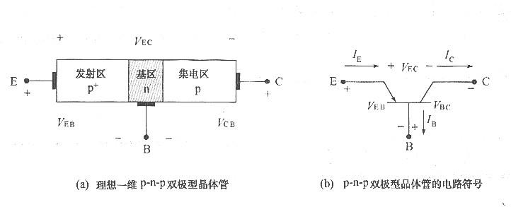 圖5.2(a)為理想的一維結(jié)構(gòu)p-n-p雙極型晶體管,具有二段不同摻雜濃度的區(qū)域,形成兩個p-n結(jié),濃度最高的p+區(qū)域稱為發(fā)射區(qū)(在圖5.2中以E定義);中間較窄的n型區(qū)域,其雜質(zhì)濃度中等,稱為基區(qū)(base,定義為B),基區(qū)的寬度需遠(yuǎn)小于少數(shù)載流子的擴