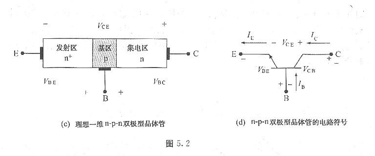 n-p-n雙極型晶體管的結(jié)構(gòu)與p-n-p雙極型晶體管是互補的,圖5.2(c)與圖5.2(d)分別是理想p-n-p晶體管的結(jié)構(gòu)與電路符號。將p-n-p雙極型晶體管結(jié)構(gòu)中的p換成n、n換成p,即為n- p-n雙極型晶體管的結(jié)構(gòu),因此電流方向與電壓極性也都相反.在下一小節(jié)中,我們將仔細(xì)討論p-n-p雙極型晶體管,因為其少數(shù)載流子(空穴)的流動方向與電流方向相同,可更直觀地了解電荷運動的機制,只要了解了p- n-p晶體管,我們只要將極性和摻雜類型調(diào)換,即可描述n-p-n晶體管