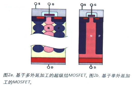 圖2‘給出了早期超級結(jié)器件的結(jié)構(gòu),傳統(tǒng)上它一直使用多外延工藝制造。豐富的N區(qū)域摻雜說明其比傳統(tǒng)平面晶體管有著了更低的電阻.P型區(qū)包圍N溝道的架構(gòu)可以實現(xiàn)所需的擊穿電壓。