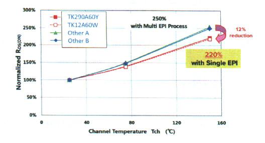 單外延工藝也使超級結(jié)MOSFET對溫度變化時有著更穩(wěn)定的性能,這有助于在更高工作溫度時維持功率變換器的效率。圖3說明了采用最新一代技術(shù)使器件標稱導(dǎo)通電阻在溫度變化顯著時減少,在150℃時導(dǎo)通電阻降低了12%。