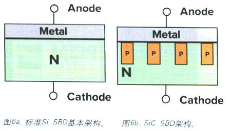 圖6a和6b給出了結(jié)構(gòu)改進后的SiC SBD與標準Si SBD的結(jié)構(gòu)對比。