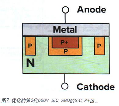 為了增加浪涌電流能力,并為電源應(yīng)用提供更強大的器件,我們在第1代架構(gòu)已進行改進并減少了調(diào)制的電導(dǎo)率(采用二極管正向電壓(VF)測試),從而實現(xiàn)更高的最大正向浪涌電流(IFSM).其中通過優(yōu)化實現(xiàn)的P+區(qū)如圖7所示。