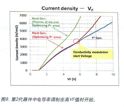 改變二極管結(jié)構(gòu)改善了電流密度和VF之間的關(guān)系,提高了奠電導(dǎo)率調(diào)制開始出現(xiàn)的電壓,如8所示圖。這樣使器件有著較高IFSM.也使第2代架構(gòu)的IFSM優(yōu)于第1代器件。