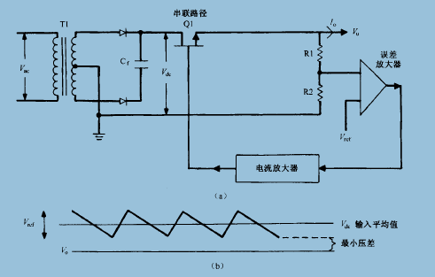 圖1.1(a)Ql與負(fù)載串聯(lián)起可變電阻作用:負(fù)反饋環(huán)通過改變其阻值以保持輸出電壓Vo的穩(wěn)定。(b)線性調(diào)整器的壓差。若串聯(lián)NPN型晶體管,則應(yīng)保證交流輸入電壓Vac最低時(shí)對(duì)應(yīng)的直流電壓的紋波谷值與輸出電壓Vo之間有2.5V的壓差反饋回路完全是直流耦合。由于整個(gè)回路沒有開關(guān)器件,所以回路各點(diǎn)的直流電壓都可預(yù)測(cè)和計(jì)算。電路中沒有變壓器并且不存在引起RFI噪聲的瞬態(tài)尖峰電壓或電流。由于晶體管不工作在開關(guān)狀態(tài),所以不存在晶體管的下降電流和上升電壓瞬時(shí)重疊造成的交流開關(guān)損耗。所有功耗只是電路各元件的直流損耗,很容易計(jì)算。