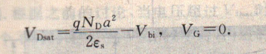 隨營漏極電壓的持續(xù)增加,最終將使得耗盡區(qū)接觸到半絕緣襯底,如圖7.ll(b)所示.此現(xiàn)象的發(fā)生是當(dāng)漏傲9Vd有W=a.由式(7),令V=-VDsat,可以求出相對應(yīng)的漏極電壓值,稱為飽和電壓(sat uration voltage)VDsat: