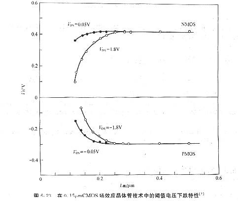 6.3.1 短溝道效應(yīng)(short-channel effect)式(45)中的閾值電壓是基于6.2,l節(jié)中的突變溝道近似推導(dǎo)得出的,也即襯底耗盡區(qū)內(nèi)的電荷僅由柵極電壓產(chǎn)生的電場(chǎng)所感應(yīng)出.換言之,式(45)中的第三項(xiàng)與源極到漏極間的橫向電場(chǎng)無(wú)關(guān).但是隨著溝道長(zhǎng)度的縮減,源極與漏極問(wèn)的電場(chǎng)將會(huì)影響電荷散布、閾值電壓控制以及器件漏電等器件特性,