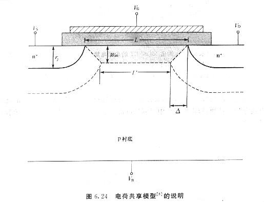 當(dāng)溝道的邊緣效應(yīng)變得不可疏忽時(shí),隨著溝道的縮減,n溝道MOSFET的閾值電壓通常會(huì)變得不像原先那么正,而關(guān)于p溝道MOSFET而言,則不像原先那么負(fù),圖6.23顯現(xiàn)了在VDS=o.05V時(shí)VT下跌的現(xiàn)象.閾值電壓F跌可用如圖6.24所示的電荷共享(chargesharing)模型來(lái)加以解釋?zhuān)藞D為一個(gè)n溝道MOSFET的剖面圖,且器件工作在線性區(qū)(VDs≤o.1V),因而漏極結(jié)的耗盡區(qū)寬度簡(jiǎn)直與源極結(jié)相同.由于溝道的耗盡區(qū)與源極和漏極的耗盡區(qū)堆疊,由柵極偏壓產(chǎn)生的電場(chǎng)所感應(yīng)生成的電荷可用這梯形區(qū)域來(lái)近似同等.