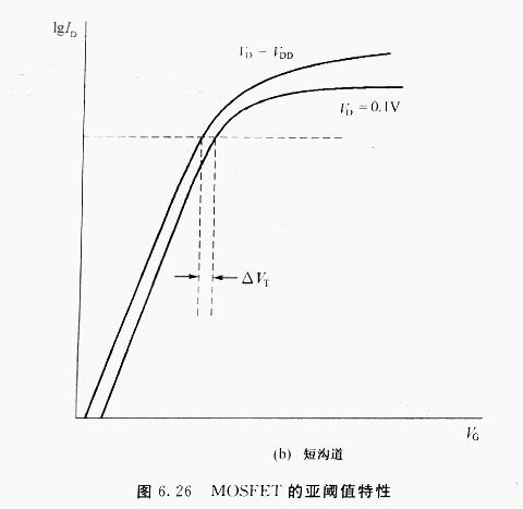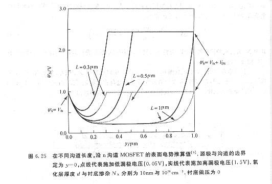 當(dāng)短溝道MOSFET的漏極電壓由線性區(qū)增至飽和區(qū)時(shí),其閾值電壓下跌將更嚴(yán)重(如圖6.23所示).此效應(yīng)稱(chēng)為舞場(chǎng)感應(yīng)勢(shì)壘降落.?dāng)?shù)個(gè)不同溝道長(zhǎng)度的n溝道器件的源極與漏極間的外表電勢(shì)如圖6.25所示,點(diǎn)線為VDS=o,實(shí)線為VDS>o.當(dāng)柵極電壓小于VT時(shí),p—型硅襯底在n+源極與漏極問(wèn)構(gòu)成一勢(shì)壘,并限制電子流由源極流向漏極.對(duì)工作在飽和區(qū)的器件而言,漏極結(jié)的耗盡區(qū)寬度遠(yuǎn)大于源極結(jié),在長(zhǎng)溝道的例子中,增加漏極結(jié)耗盡區(qū)寬度并不會(huì)影響勢(shì)壘高度(參閱圖6.25中l(wèi)μm的例子).但當(dāng)溝道長(zhǎng)度足夠短時(shí),漏極電壓的增加將減小勢(shì)壘高度(圖6.25中o.3μm與o.5μm的例子),此歸因于漏極與源極太接近所形成的外表區(qū)的電場(chǎng)浸透,此勢(shì)牟降低效應(yīng)會(huì)招致電子由源極注入漏極,形成亞閾值電流的增加.因而在短溝道器件中,閡值電壓會(huì)隨漏極電壓增加而降低.