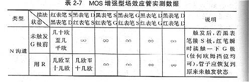 關(guān)于MOS增強(qiáng)型場(chǎng)效應(yīng)管,丈量數(shù)據(jù)見表2-7。至于MOS耗盡型場(chǎng)效應(yīng)管,平常柵極不允許開路,普通不作業(yè)余測(cè)量。