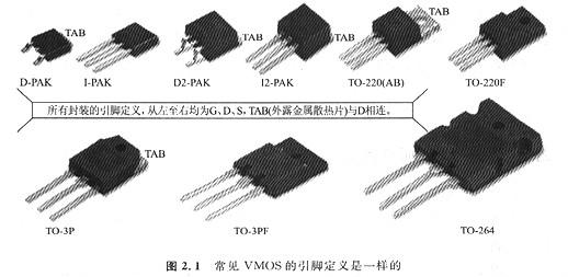 除了小型封裝的VMOS場(chǎng)以外,多數(shù)MOS場(chǎng)效應(yīng)管單管的引腳排列順序是一樣的(圖2.1),極少有例外。讓VMOS的引腳向下,使有字的一面朝向自己,那么從左至右就是G(柵極)、D(漏極)、S(源極),TAB表示散熱片,與漏極相通。小型封裝、多管封裝等則需要查閱器件的技術(shù)手冊(cè),沒(méi)有統(tǒng)一規(guī)律可循。