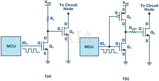 為了解決此問(wèn)題,pMOSFET Q3可以作為上拉器件,其以與Q1互補(bǔ)的方式工作,如圖1b所示。PMOS具有較低導(dǎo)通電阻和非常高的關(guān)斷電阻,驅(qū)動(dòng)電路中的功耗大大降低。為在柵極轉(zhuǎn)換期間控制邊沿速率,Q1 的漏極和Q2的柵極之間外加一個(gè)小電阻。