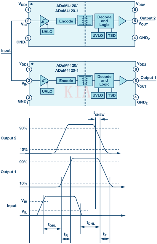 柵極驅(qū)動(dòng)器時(shí)序參數(shù)對(duì)評(píng)估其性能至關(guān)重要。包括ADuM4120在內(nèi)的所有柵極驅(qū)動(dòng)器的一個(gè)常見(jiàn)時(shí)序規(guī)格(如圖5所示)是驅(qū)動(dòng)器的傳播延遲(tD) ,其定義為輸入邊沿傳播到輸出所需的時(shí)間。