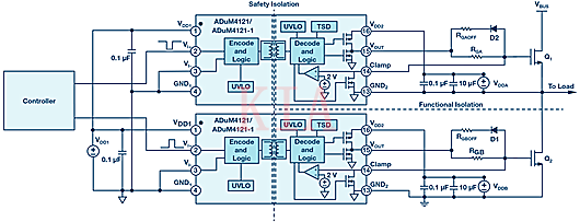 如果驅(qū)動(dòng)電路沒(méi)有用于接地參考的隔離,則將需要大于VBUS 的電壓來(lái)驅(qū)動(dòng)Q1。這是一個(gè)繁瑣的解決方案,對(duì)于高效系統(tǒng)來(lái)說(shuō)并不實(shí)用。因此,人們需要經(jīng)過(guò)電平轉(zhuǎn)換并以高端晶體管源極為基準(zhǔn)的控制信號(hào)。這被稱(chēng)為功能隔離,可以利用隔離式柵極驅(qū)動(dòng)器(如ADuM4223)來(lái)實(shí)現(xiàn)。