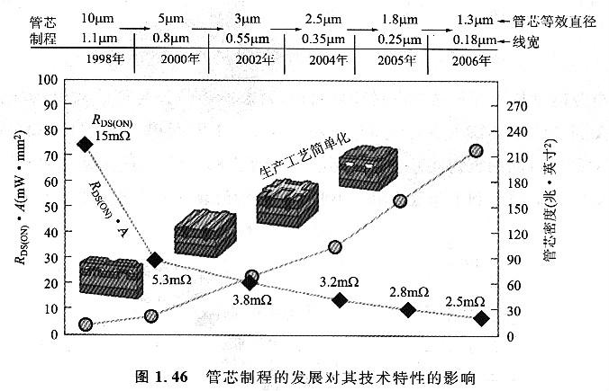 一個相對客觀的辦法是將管芯面積的要素思索進來,將管芯面積A與RDS(ON)相乘,得到一個名為“本征電阻”的參數(shù)以減少電流規(guī)格的影響(圖1.46)。本征電阻小,就意味著要么電流規(guī)格很高,要么適用的開關(guān)頻率很高。另一方面,管芯制程(芯片的設(shè)計與制造規(guī)程)的開展使管芯單元的密度逐步提高,也有利于管芯的小型化。在功率半導(dǎo)體方面,耗散功率會限制管芯制程的進一步減小,這方面還是滯后于小功率IC的。