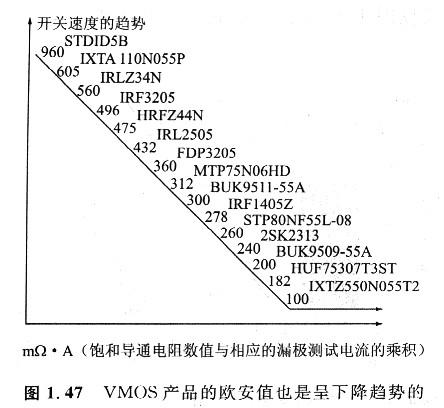 在普通狀況下,我們很難從公開的技術(shù)材料中查閱到管芯的詳細大小,一個粗略的替代辦法是,能夠用產(chǎn)品技術(shù)手冊中給出RDS(ON)和丈量這一數(shù)值所采, 用的漏極電流相乘,我們權(quán)且稱這個數(shù)值為“歐安值”。用歐安值也能得到相似的結(jié)果,如圖1. 47所示。