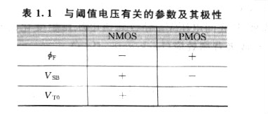 式中,q是電子電荷,1.6X 10-19[C];εsi是硅的相對(duì)介電常數(shù),εsi= 11.7;Nsub是襯底(阱)的雜質(zhì)濃度。γ越大,表示襯底偏置效應(yīng)越強(qiáng)。關(guān)于NMOS和PMOS來說,與閾值電壓有關(guān)的參數(shù)的極性是不同的,表1.1列出這些參數(shù)及其極性。