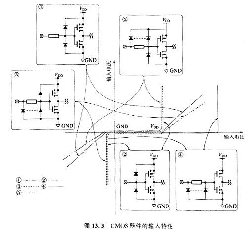 圖13.3示出CMOS器件的輸入等效電路(以F寫作輸入電路)以及輸入電流—輸入電壓特性。CMOS的輸入端附加有防靜電和外來浪涌進(jìn)入輸入柵極的維護(hù)電路。CMOS的輸入柵極電阻是幾十MQ以上的高電阻(高阻抗),所以實(shí)踐的輸入特性看到的是維護(hù)電路的特性。CMOS輸入電路(維護(hù)電路)可分為以下四品種型: