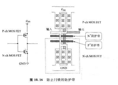 CMOS中,由于閂鎖現(xiàn)象/可控硅現(xiàn)象的緣由,需求思索設(shè)置恰當(dāng)?shù)膭e離寄生雙極晶體管的稱為防護(hù)帶(圖10. 16)的別離墻/過渡電流吸收帶。不過對集成度的影響不大。最近,還開發(fā)出不需求防護(hù)帶的制造技術(shù)。而且,由于CMOS的低功耗特性,在發(fā)熱問題上比雙極器件優(yōu)越,也有利于集成化。