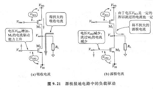 另一方面,Vout上升時,自輸出端流向負(fù)載電阻的電流(源極電流)取不出那么大的值。原因是p溝MOS晶體管Mi的源極-柵極間電壓VSG1是一定的,M1能夠流出的電流沒有變化。這種情況示于圖9.21(b)中。因此,這個輸出電路流出的電流不能夠超越M1的穩(wěn)定的源極電流。在需求輸出大的源極電流的場合,要求輸出電路必需經(jīng)常流過與源極電流相等的靜態(tài)電流(無功電流)。這關(guān)系到效率的下降。 為了以小的靜態(tài)電流獲得無論是源極電流還是吸收電流都需求的大的輸出電流,應(yīng)該思索AB級輸出電路。