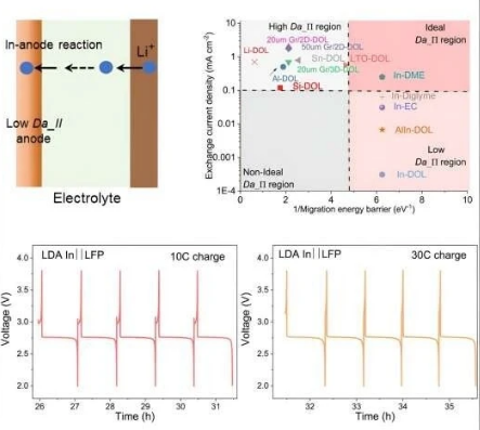 新研究表明,銦作為電池陽極擁有兩個(gè)關(guān)鍵特性:極低的遷移能量勢(shì)壘,使離子能在固態(tài)中快速擴(kuò)散;減少與陽極中離子的交換電流密度,減緩表面反應(yīng)——這兩大特性結(jié)合,對(duì)于快速充電和長時(shí)間儲(chǔ)存電能至關(guān)重要。
