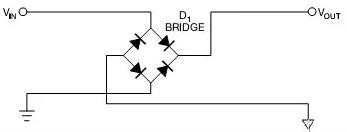 圖2 是一個橋式整流器,不論什么極性都可以正常作業(yè),但是有兩個二極管導通,功耗是圖1的兩倍