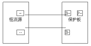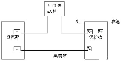 調(diào)恒流源為3.7V/500mA;萬用表設(shè)置為uA檔,表筆插入uA接孔,然后與恒流源串聯(lián)起來接保護(hù)板B+、B-如下圖所示:此時(shí)萬用表的讀數(shù)即為保護(hù)板的自耗電,如無讀數(shù)用鑷子或錫線短接B-、P-,激活電路。