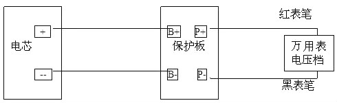 用萬用表分別測(cè)3+、P+間及B-、P-間電壓。所得電壓值即為保護(hù)板的內(nèi)阻,因?yàn)殡娐分械碾娏鳛長(zhǎng)A,根據(jù)歐姆定律:R=U/I。