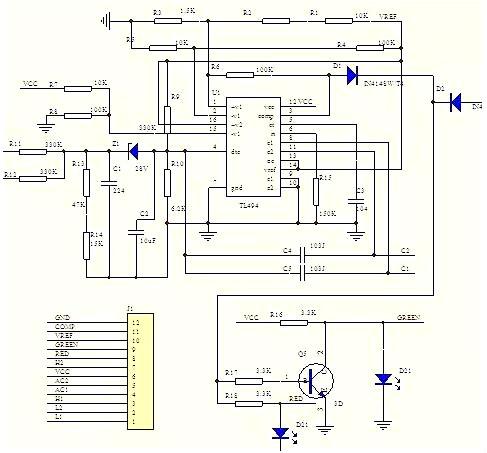 輸出脈沖的寬度是通過電容CT上的正極性鋸齒波電壓與另外兩個(gè)控制信號進(jìn)行比較來實(shí)現(xiàn)。功率輸出管Q1和Q2受控于或非門。當(dāng)雙穩(wěn)觸發(fā)器的時(shí)鐘信號為低電平時(shí)才會被選通,即只有在鋸齒波電壓大于控制信號期間才會被選通。當(dāng)控制信號增大,輸出脈沖的寬度將減小。(7)腳接地端,(8)、(11)腳是Q1和Q2內(nèi)部開關(guān)管的集電極,在此電路中接電源,(9)、(10)腳為Q1、Q2的發(fā)射極,作開關(guān)管驅(qū)動輸出端,接下圖中Q1與Q2外部放大電路。以驅(qū)動后極推挽電路。(12)腳電源端,(13)腳為輸出控制端,接(14)腳基準(zhǔn)電壓時(shí)兩路輸出脈沖相差180方位,每路輸出量大約200MA的驅(qū)動推挽或半橋式電路。(15)、腳第二組放大器的反相輸入端,接基準(zhǔn)電壓, (16)腳同相輸入端,檢測電源電壓。當(dāng)電壓過高超過(15)腳參考電壓時(shí),(3)腳輸出高電平,電路進(jìn)入保護(hù)狀態(tài)。