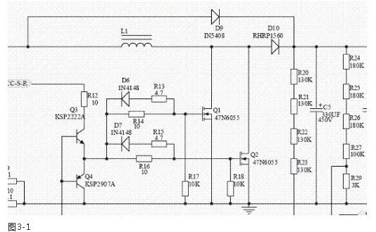 圖3-1所示;是三星V2屏等離子開關(guān)電源的PFC激勵(lì)部分。從圖中可以看出;這是一個(gè)并聯(lián)開關(guān)電源L1是儲(chǔ)能電感,D10是這個(gè)開關(guān)電源的整流二極管,Q1、Q2是開關(guān)管,為了保證PFC開關(guān)電源有足夠的功率輸出,采用了兩只MOS管Q1、Q2并聯(lián)應(yīng)用(圖3-2所示;是該并聯(lián)開關(guān)電源等效電路圖,圖中可以看出該并聯(lián)開關(guān)電源是加在整流橋堆和濾波電容C5之間的),圖中Q3、Q4是灌流激勵(lì)管,Q3、Q4的基極輸入開關(guān)激勵(lì)信號(hào), VCC-S-R是Q3、Q4的VCC供電(22.5V)。兩只開關(guān)管Q1、Q2的柵極分別有各自的充電限流電阻和放電二極管,R16是Q2的在激烈信號(hào)為正半周時(shí)的對(duì)Q2柵極等效電容充電的限流電阻,D7是Q2在激烈信號(hào)為負(fù)半周時(shí)的Q2柵極等效電容放電的放電二極管,同樣R14、D6則是Q1的充電限流電阻和放電的放電二極管。R17和R18是Q1和Q2的關(guān)機(jī)柵極電荷泄放電阻。D9是開機(jī)瞬間浪涌電流分流二極管。