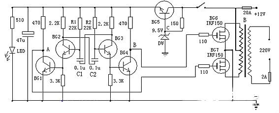 這是一款非常容易制作的逆變器,可以將12V電源電壓變?yōu)?20V市電,電路由BG2和BG3組成的多諧振蕩器推動,再通過BG1和BG2驅動,來控制BG6和BG7工作。