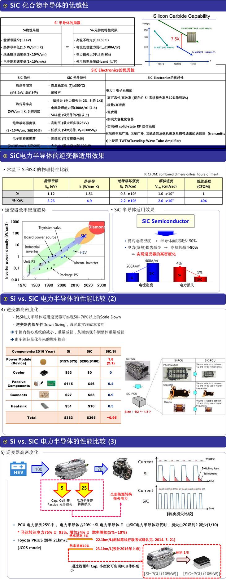 具 體來看,其整體優(yōu)勢主要體現(xiàn)在下面幾個方面:一是SiC功率器件帶來開關(guān)損耗的大幅降低,可以大大提高系統(tǒng)的效率;二是因為SiC器件無反向恢復、散熱性 能好等特點,減少周邊器件的使用或者采用體積較小的器件,線路也得到優(yōu)化,從而在整體上縮減了系統(tǒng)尺寸;最后,因為效率提高、器件精簡從而獲得了系統(tǒng)整體 成本的節(jié)約。