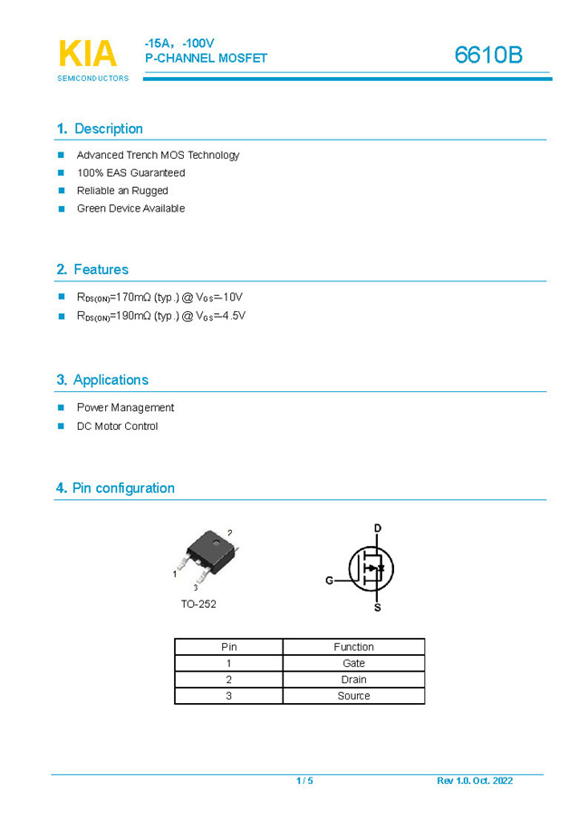 參數(shù): ID(A): -15 BVDSS(V): -100 RDS(ON): 170mΩ Qg(nC): 19 Package: TO-252