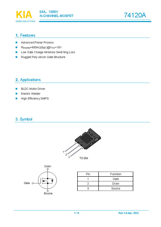 參數(shù): ID(A): 23    BVDSS(V): 1200    RDS(ON): 480mΩ    Qg(nC): 185    Package: TO-264