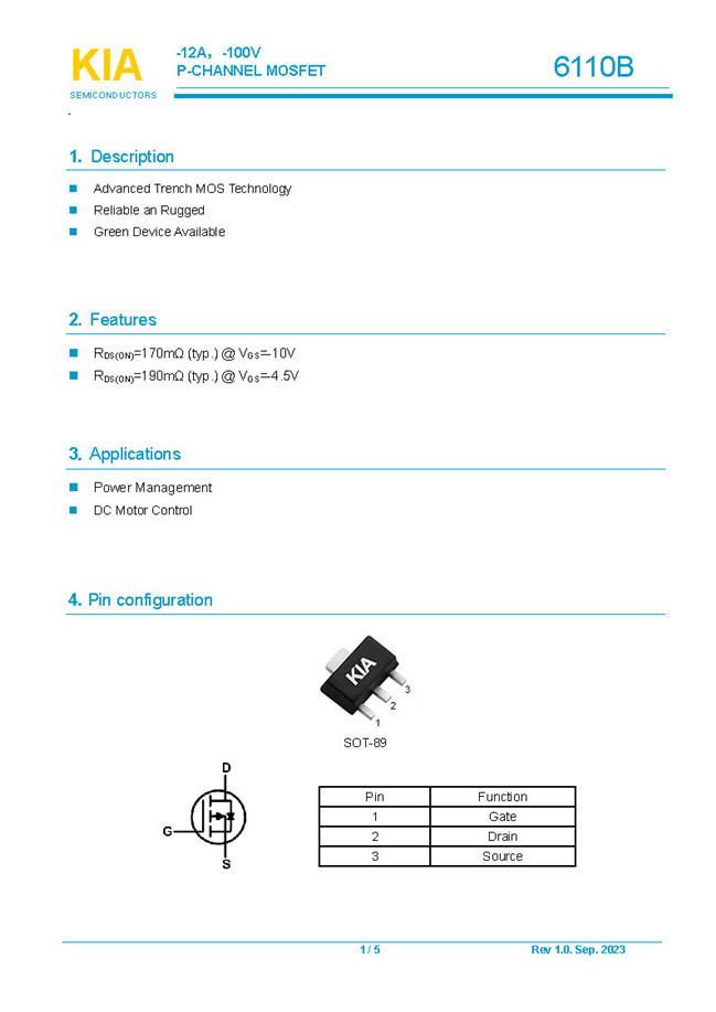 參數(shù): ID(A): -12    BVDSS(V): -100    RDS(ON): 170mΩ    Qg(nC): 19    Package: SOT-89