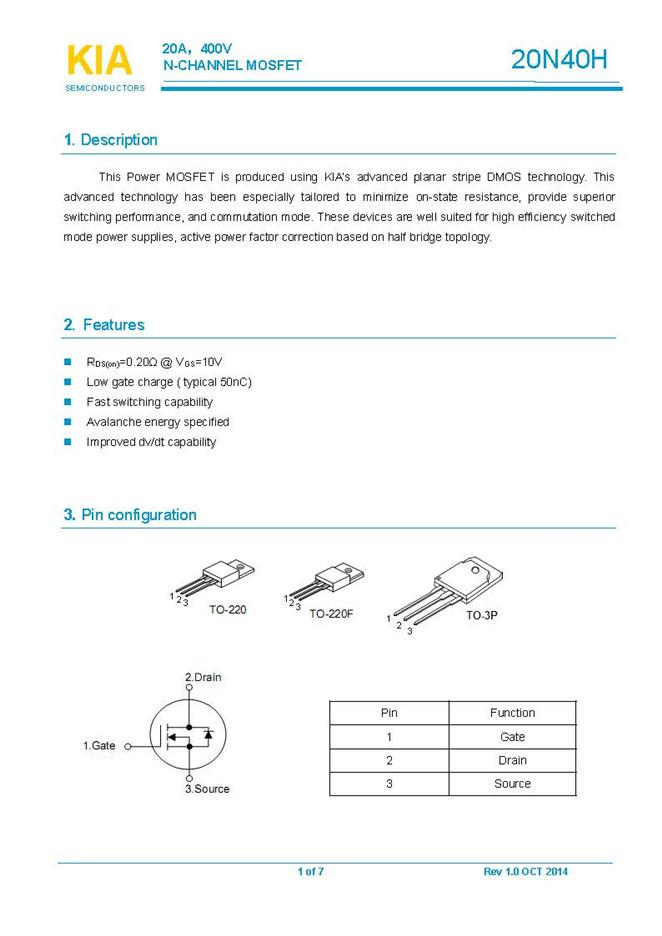 參數(shù): ID(A): 20    BVDSS(V): 400    RDS(ON): 0.25    Qg(nC): 50    Package: TO-220、TO-220F、TO-3P